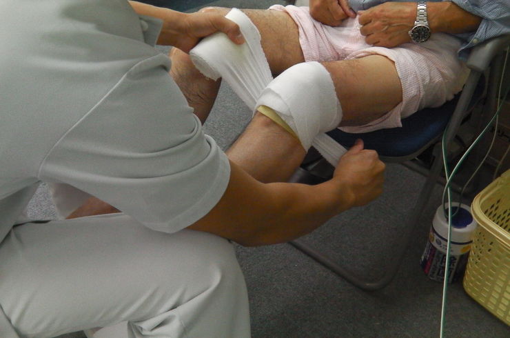 1、まずはサラシを巻きます。膝のサラシ固定の巻き方については動画も載っているのでぜひご覧になってください。これにより膝の関節面で上にある骨と下にある骨の衝突を防ぎます。3週間、状況にもよりますがほぼ毎日巻きます。これにより膝にかかる「負担度」よりも「安静度」を上回るようにします。そうすると自然治癒力が身につきます。この自然治癒力こそが痛みをとるのに重要な存在なのです。