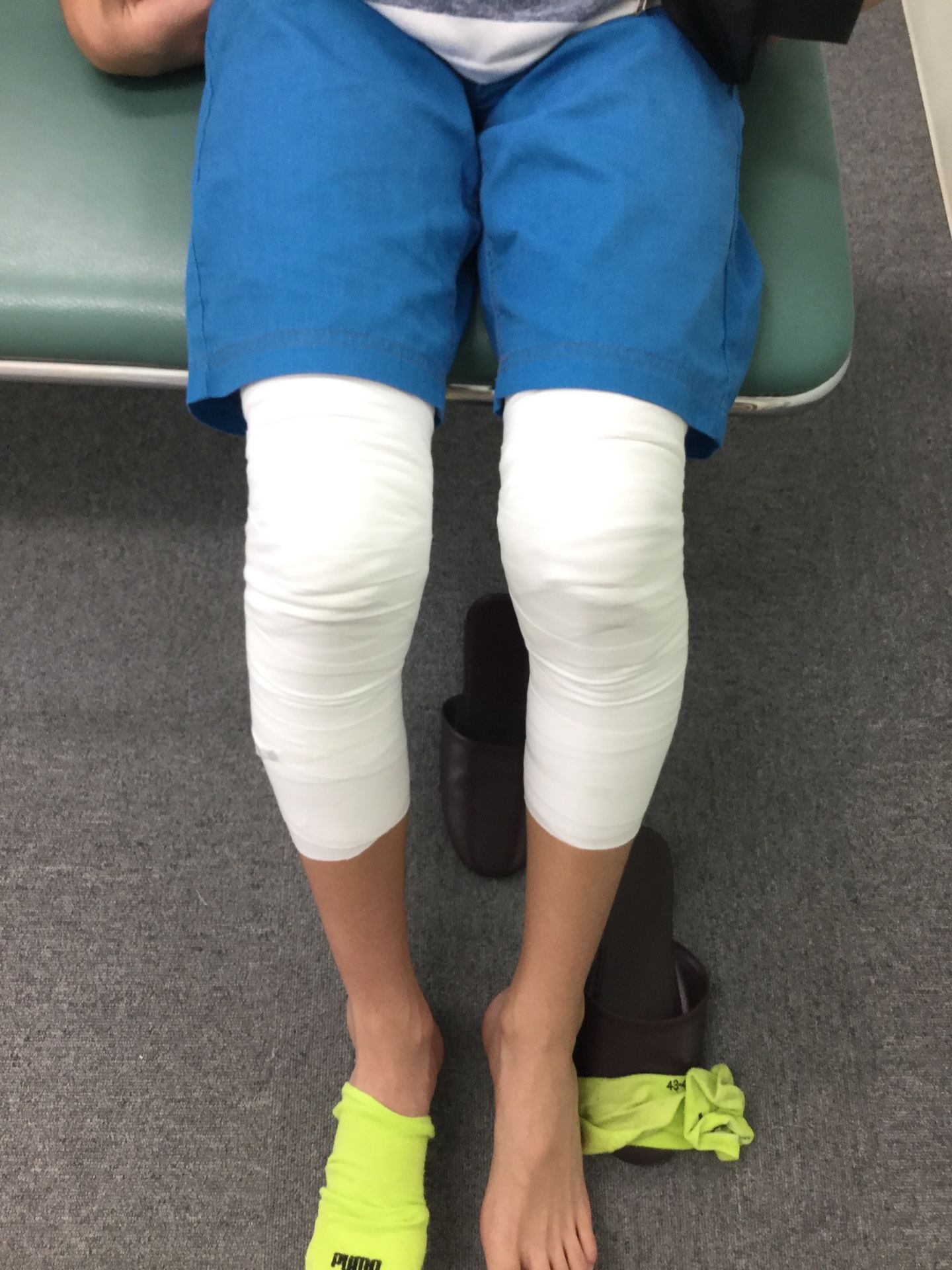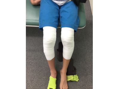 その後、その位置を保ってもらうために包帯を両膝に巻きました。2~3週間の治療期間を予定しています。