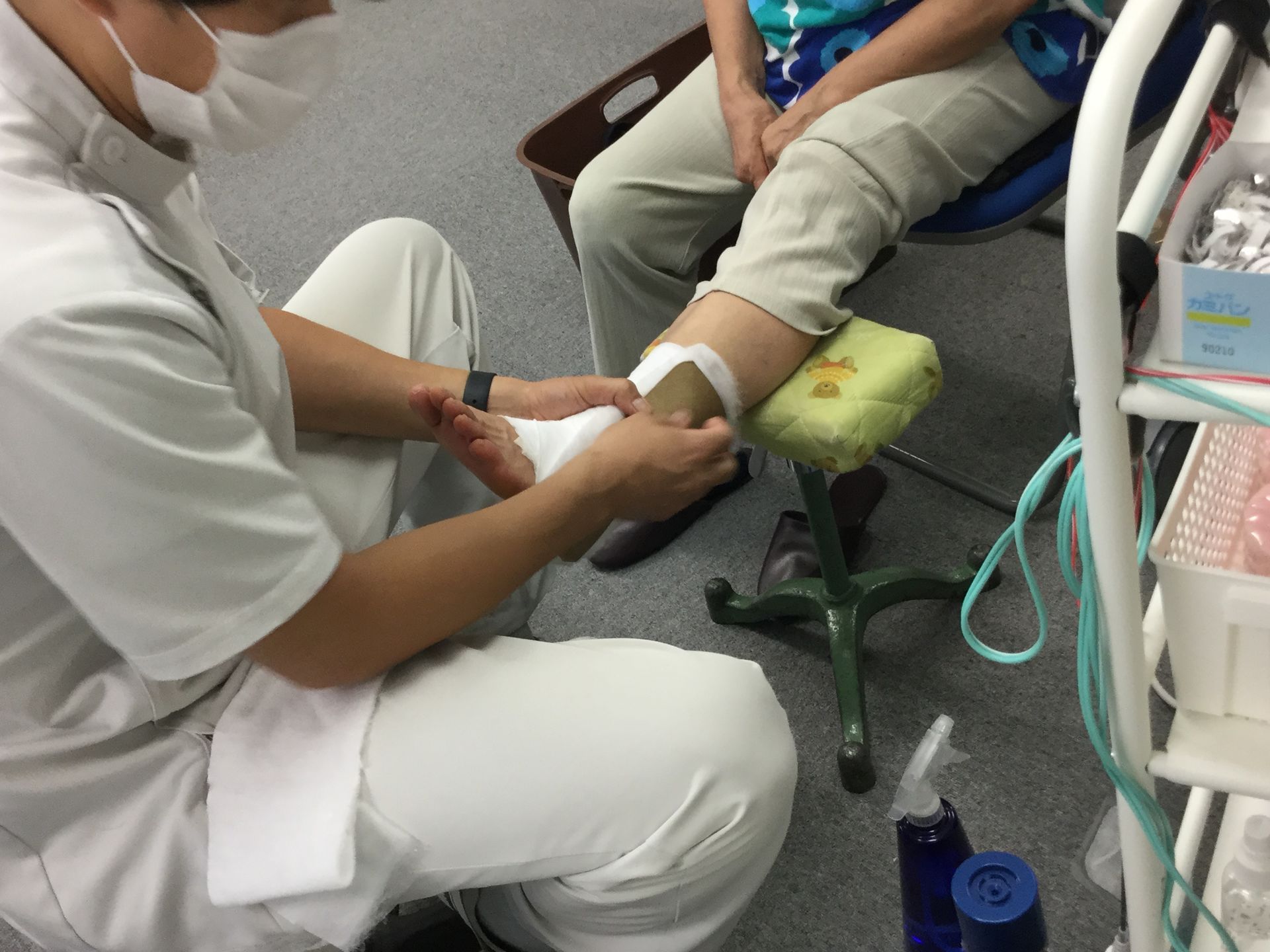 手も少し腫れていたので足首と一緒に診たのですが異常はありませんでした。足首は腫れてしまい皮下出血もみえるほど損傷はひどかったです。電気治療器具で炎症を散らし手技を施し、包帯の中に厚紙を入れ固定を施しました。